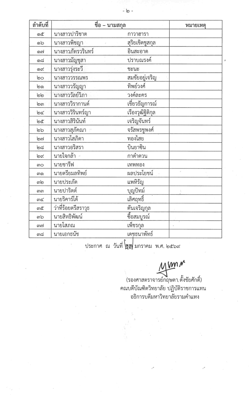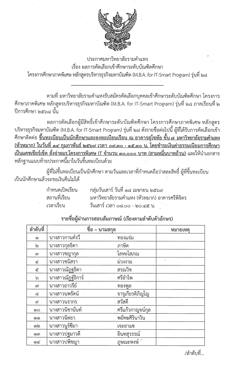 **กำหนดการ** พุธที่ 28 มกราคม 2569 ประกาศรายชื่อผู้มีสิทธิ์เข้าศึกษาต่อ |