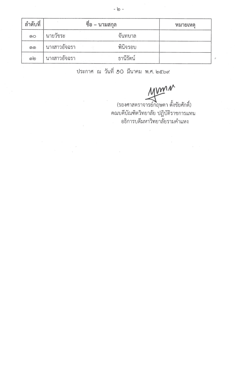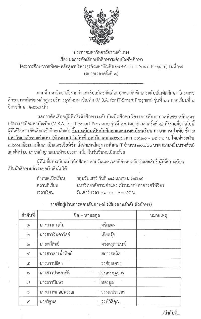 **กำหนดการ** อังคารที่ 10 มีนาคม 2569 ประกาศรายชื่อผู้มีสิทธิ์เข้าศึกษาต่อ |